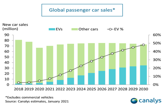 Электромобили – один из важнейших технологических трендов в мире. По данным обзора Международного энергетического агентства (МЭА) в первом квартале 2022 года продажи электромобилей в мире выросли на 75 процентов по сравнению с аналогичным периодом в 2021-м. Основная причина роста – минимальное воздействие на окружающую среду. По прогнозам Исследовательского центра «Canalys» к 2030 году использование электрокаров вырастет до 48% по сравнению с 2020 годом (см. рис.).