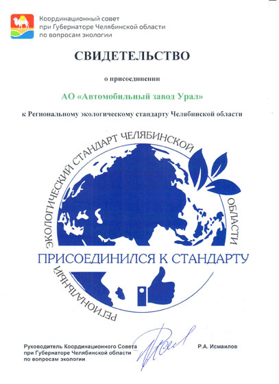 Автомобильный завод «Урал» (Миасс. Челябинская область) присоединился к Региональному экологическому стандарту – официальное свидетельство об участии в проекте представителям компании вручили в ходе заседания координационного совета при губернаторе по вопросам экологии руководитель совета Рашид Исмаилов и заместитель главы региона Александр Козлов.