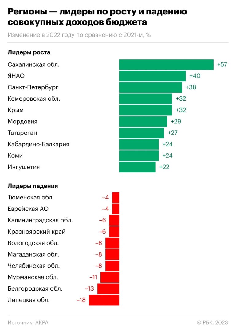 Несколько лучше экономическая ситуация в Красноярском крае, Калининградской области, Еврейской автономной области и Тюменской области, где спад составил от четырех до шести процентов. В то же время доходы бюджета в Сахалинской области выросли на 57 процентов, в Ямало-Ненецком автономном округе — на 40%, а в Санкт-Петербурге — на 38%.