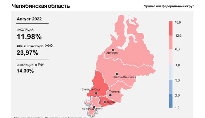 В целом по России годовая инфляция в августе составила 14,3%, в Уральском федеральном округе – 12,17%.