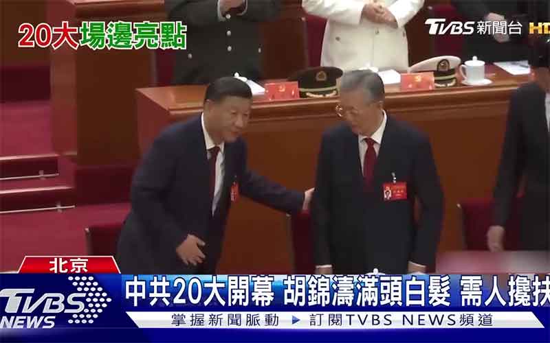 Во фрагменте из новостей телеканала TVBS News запечатлен момент, как Си Цзиньпина учтивым жестом приглашает Ху Цзиньтао сесть в кресло в президиуме.