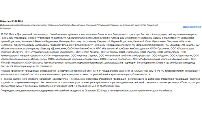 В деле 47 ответчиков, в том числе 34 организации, зарегистрированные в Челябинской, Курганской, Свердловской, Херсонской, Московской областях, в Москве, на Кипре и в Нидерландах, а также 13 физических лиц. Среди последних Михаил Юревич и члены его семьи – Валерий, Наталья и Александр Юревичи, Вадим и Ирина Белоусовы. Среди компаний-ответчиков АО «Макфа», АО «Первый хлебокомбинат», АО «СМАК» и другие.