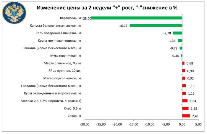 картофель, кг – на 28% (-9,47 рубля); капуста белокочанная свежая, кг – на 16,17% (-3,20 рубля); соль поваренная пищевая, кг – на 2,78% (-0,45 рубля).Последние новости