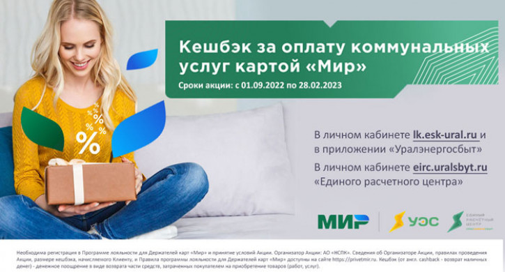 С 1 сентября 2022 года жители Южного Урала смогут получать кешбэк* 1% за оплату услуг ЖКХ, входящих в единую квитанцию Уралэнергосбыт. Это станет возможным благодаря акции платежной системы «Мир», проводимой в содружестве с "Уралэнергосбыт. Максимальную сумму возврата смогут получать жители Челябинска, так как они имеют единую платежку за электрическую энергию, теплоснабжение и ГВС, а кешбэк рассчитывается со всей суммы платежа.