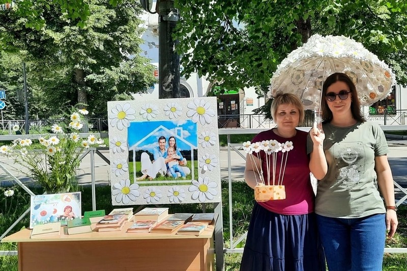 Центральная районная библиотека пригласила своих читателей познакомиться с тематической выставкой книг российских авторов, читая которые ещё раз убеждаешься, что только любовь и верность создают семью, являющуюся главной ценностью человека. В клубе «Забота» прошла литературно-игровая программа «Что может быть семьи дороже». Собравшиеся в этот день в клубе с интересом прослушали рассказ о жизни Петра и Февронии, поговорили о семейных ценностях и традициях, поучаствовали в викторинах и конкурсах. Рядом с библиотекой была организована фотозона «Ромашковое счастье», где прохожие могли познакомиться с книгами, сделать фотографию на память и получить в честь праздника ромашку с самыми добрыми пожеланиями любви и счастья.