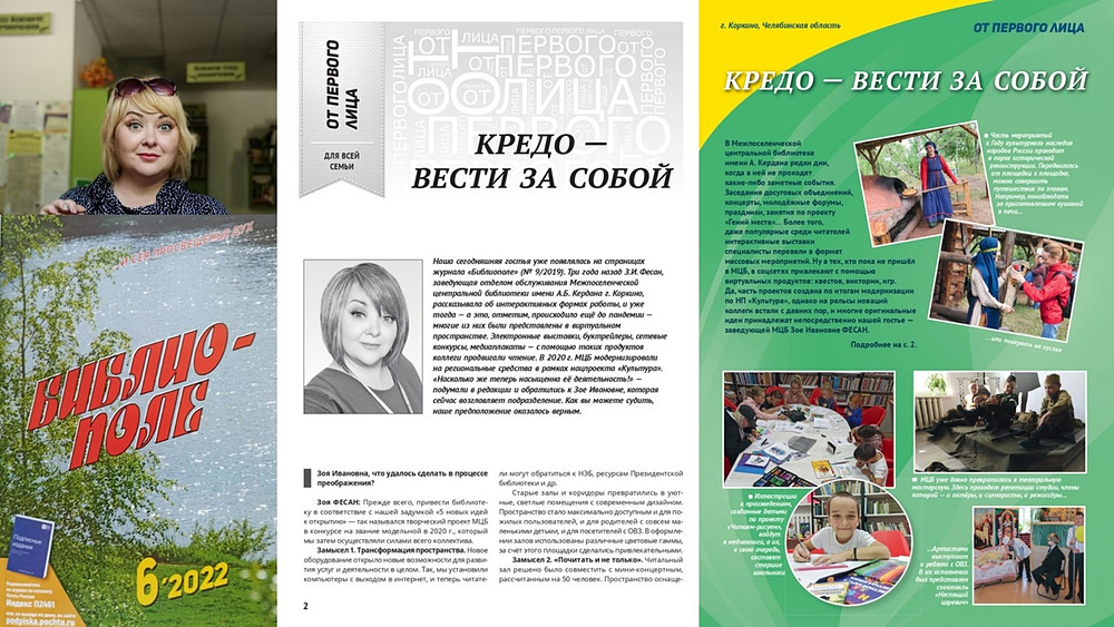 Для библиотечных специалистов будет интересен опыт работы Межпоселенческой центральной библиотеки им. А. Кердана Коркинского района. В профессиональном журнале «Библиополе», №6, 2022 год, стр 2-10 вышла новая статья Зои Ивановны Фесан (заведующей МЦБ им. А. Кердана).