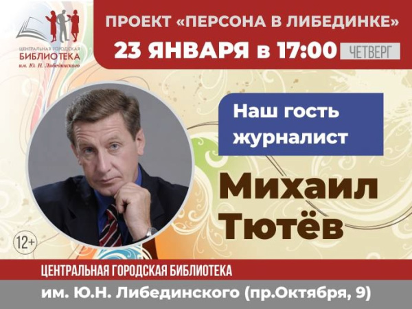 Друзья, в четверг 23 января в центральной городской библиотеке им. Ю.Н. Либединского состоится встреча с журналистом Михаилом Тютёвым.