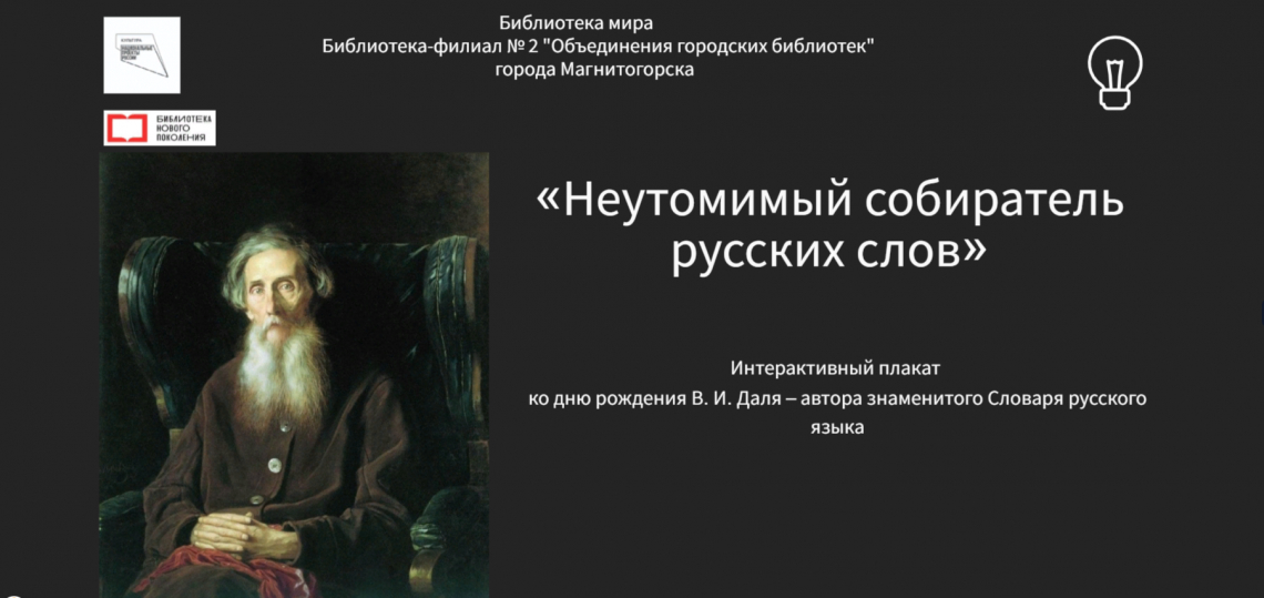 Библиотека мира подготовила интерактивный плакат , в котором размещены интересные факты биографии В.И. Даля, как создавался словарь, полный список других произведений В. Даля и цитаты из них, а также пословицы и поговорки из знаменитого словаря, фотографии памятников и памятных мест, связанных с русским лексикографом, с рассказами о них, а также фильмы о нашем знаменитом соотечественнике.