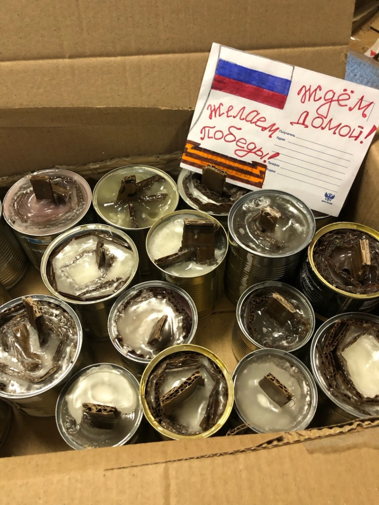 Собраны необходимые вещи: палатки, носки, перчатки, термобелье ,стельки - самогрейки, металлические термосы, медикаменты от простуды, сан.-гигиенические принадлежности, батарейки, моющие средства и печь- буржуйка (шк. 38) и, конечно, детские рисунки поздравления, письма, сладкие гостинцы к празднику. Во всех детских трогательных поздравлениях и письмах - пожелания Победы и скорого возвращения домой. Отдельное спасибо за помощь и организацию акции директору МБУ "Арена" Родину Сергею Ивановичу.
