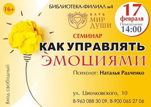 Приглашаем на очередное заседание клуба «Мир души», которое пройдёт в библиотеке-филиале № 4. Для участников клуба психолог Наталья Радченко проведет семинар на тему «Как управлять эмоциями».