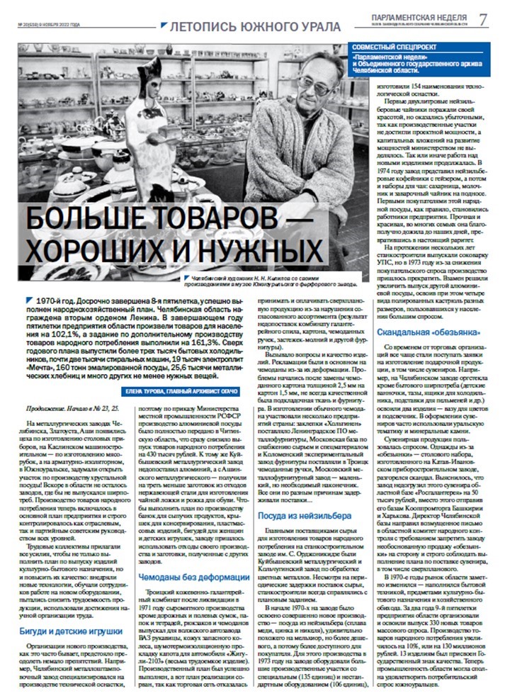 Очередной номер газеты Законодательного Собрания Челябинской области «Парламентская неделя» вышел со статьей главного архивиста Объединенного государственного архива Челябинской области Е.П. Туровой «Больше товаров – хороших и нужных». Совместный проект газеты и архива пополнился еще одной публикацией, рассказывающей о важных событиях истории Южного Урала. В статье идет речь о товарах народного потребления, которые выпускались предприятиями Челябинской области в 1970-е годы. Тогда, пишет автор, предприятия области произвели товаров для населения на 102,1%, а задание по дополнительному производству товаров народного потребления выполнили на 161,3%. Сверх годового плана выпустили более трех тысяч бытовых холодильников, почти две тысячи стиральных машин, 19 тысяч электроплит «Мечта», 160 тонн эмалированной посуды, 25,6 тысячи металлических хлебниц и много других не менее нужных вещей.