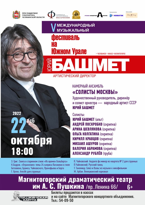 22 октября в 18:00 Концертное объединение приглашает гостей и жителей города на концерт Юрия Башмета, который пройдет в рамках V Международного музыкального фестиваля на Южном Урале при поддержке губернатора Челябинской области.