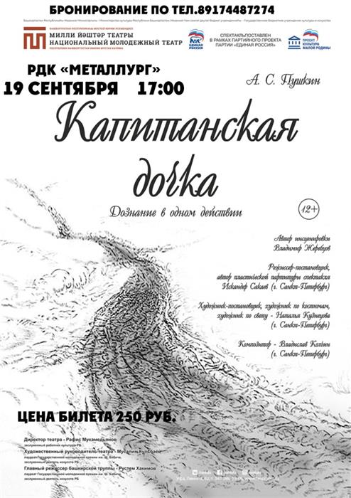 19.09.2022г. - спектакль «Капитанская дочка» (Национальный Молодёжный театр им. М. Карима , г. Уфа) - РДК "Металлург", 17.00ч.Бронирование мест и все вопросы по тел. 89174487274 (Татьяна Анатольевна). Купить билеты здесь https://www.ticketland.ru/specialSale/?code=eKHK3PoXHqNAl8P1