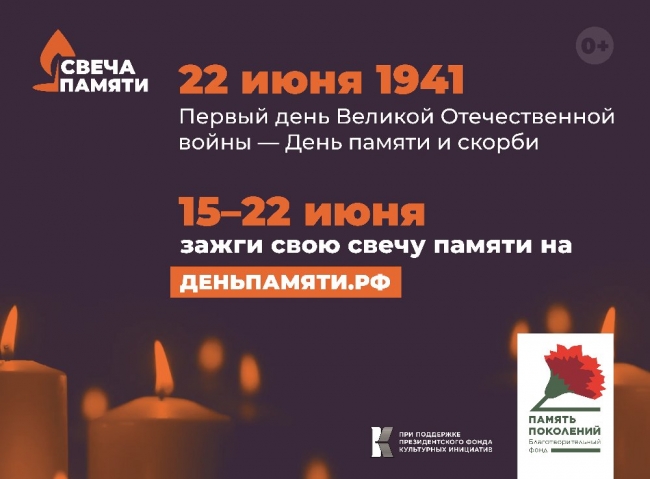 Любой желающий с 15 по 22 июня может присоединиться к онлайн-акции «Свеча памяти» и «зажечь» на сайте деньпамяти.рф свою виртуальную свечу. Благотворительный фонд «Память поколений», организатор акции, выделит на оказание медицинской помощи ветеранам Великой Отечественной войны 1 рубль за каждую зажженную свечу. Также на сайте размещены несколько десятков видеоисторий ветеранов с воспоминаниями о войне и интерактивная карта, на которой можно посмотреть, в каком регионе сколько свечей зажгли.