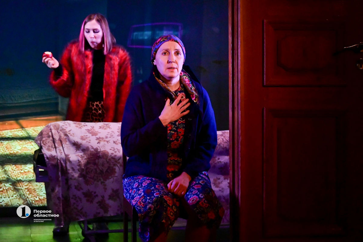 Спектакль показывают в подвале Челябинского Молодежного, рядом с буфетом, в проеме двери. Символика понятная — дверь как граница между миром живых и мертвых. Как, опять же, пресловутое ружье — она должна в конце концов захлопнуться.