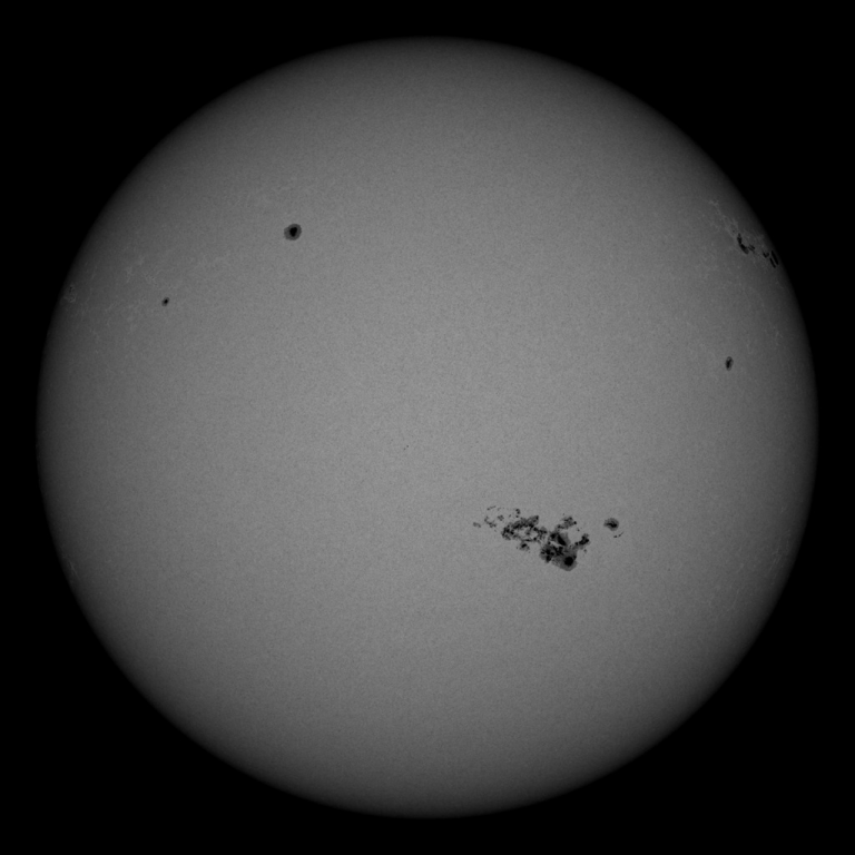 Если посмотреть сегодня на Солнце в телескоп, то мы увидим на фотосфере вот такую картину:
