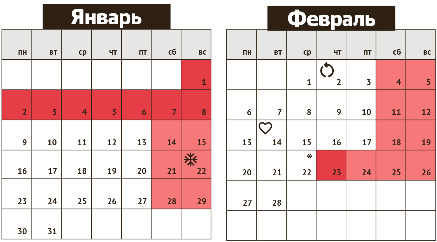 с воскресенья 1 января — на пятницу 24 февраля; с воскресенья 8 января — на понедельник 8 мая.22 февраля, 7 марта, 3 ноября — сокращенные рабочие дни (ПОД ЗВЕЗДОЧКОЙ).