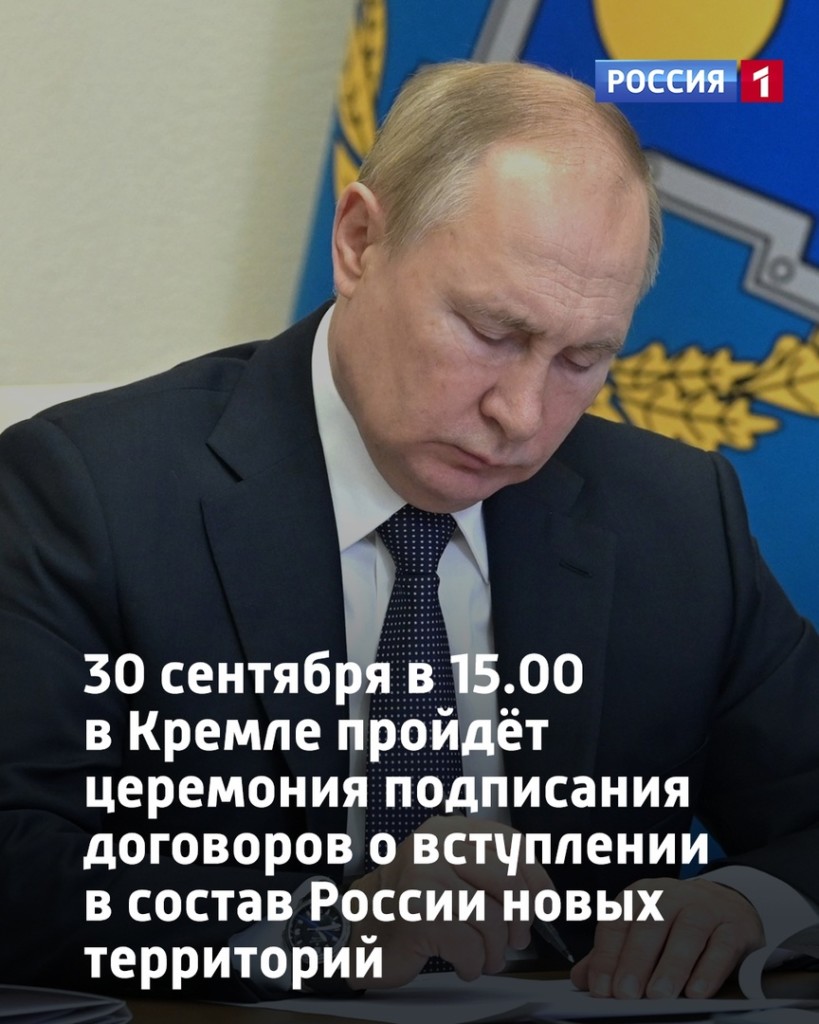 Завтра в 15 часов по московскому времени в Кремле должна пройти церемония подписания договоров о вхождении в состав России ДНР, ЛНР, Херсонской и Запорожской областей.