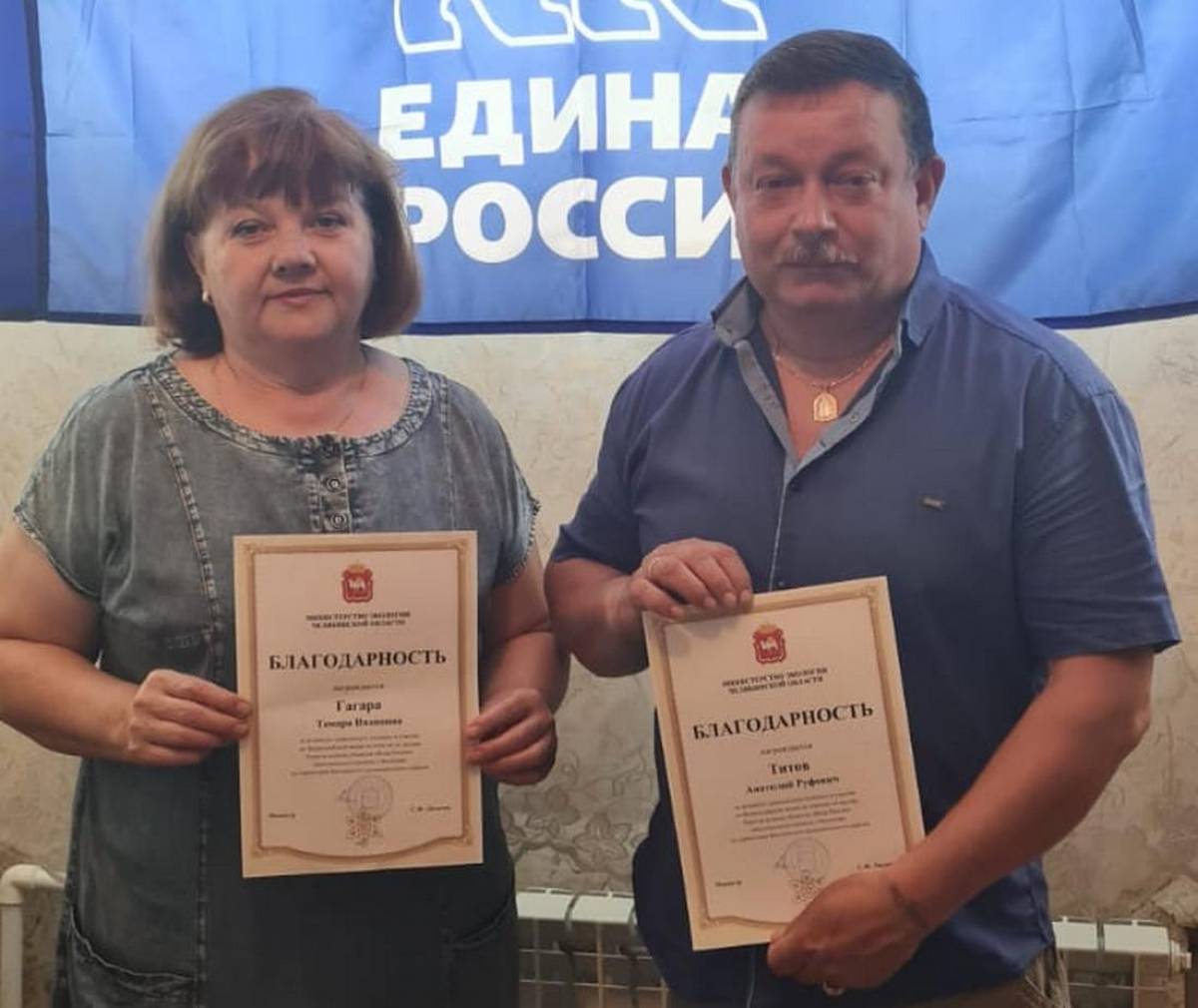 В рамках федерального проекта «Чистая вода» членам первичной ячейки Каслинского местного отделения партии «Единая Россия» Тамаре Гагара и Анатолию Титову были вручены благодарности Министерства экологии Челябинской облас