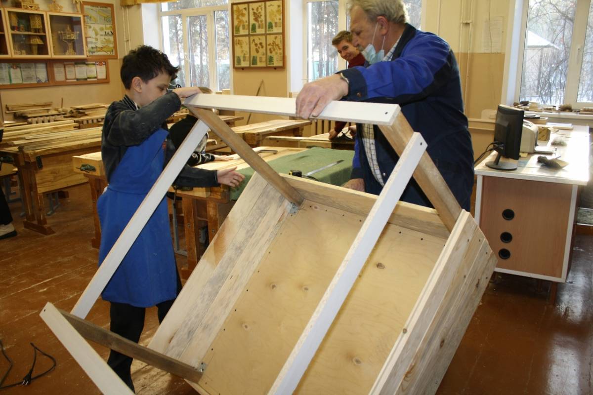 Член фракции «Единая Россия» Екатерина Бачинина, ребята из 128-й школы на уроках труда вместе со своим наставником Юрием Владимировичем Ивановым мастерят утеплённые домики для собак.