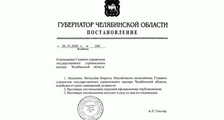 Начальником Главного управления государственного строительного надзора Челябинской области назначен Кирилл Мозгалев, передает корреспондент Агентства новостей «Доступ».