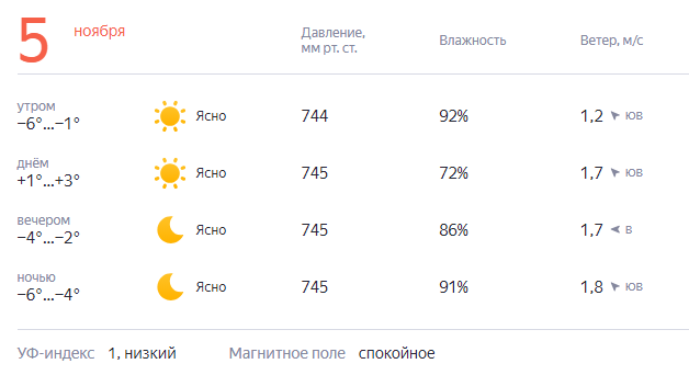 В воскресенье, пятого ноября, в Челябинской области ожидается переменная облачность, преимущественно без осадков. Ночью — три-восемь градусов ниже нуля, днем – плюс один-шесть градусов. Южный, юго-западный ветер будет дуть со скоростью 3-8 метров в секунду.