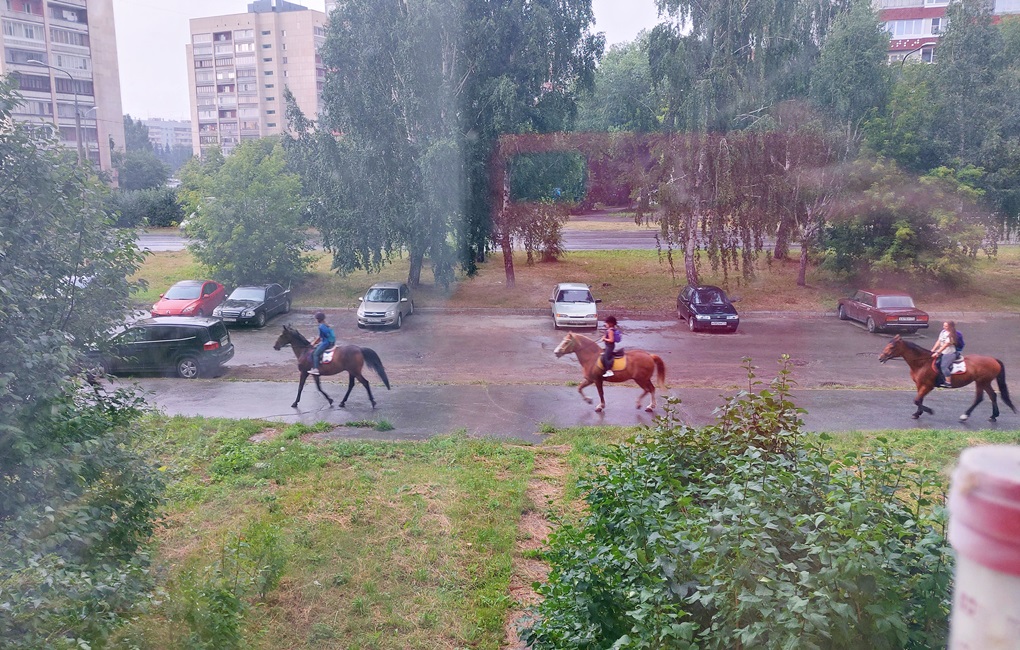 Вот такую кавалькаду (примерно из 10 всадников) можно было увидеть на тротуаре Дзержинского, 53, и несколько лошадиных куч возле К.М., 4.