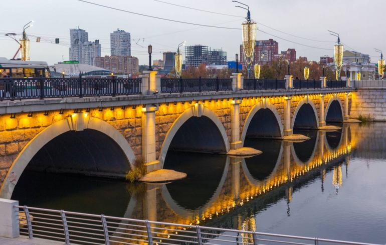 На все праздничные дни в Челябинске включили архитектурную подсветку мостов в центре города.