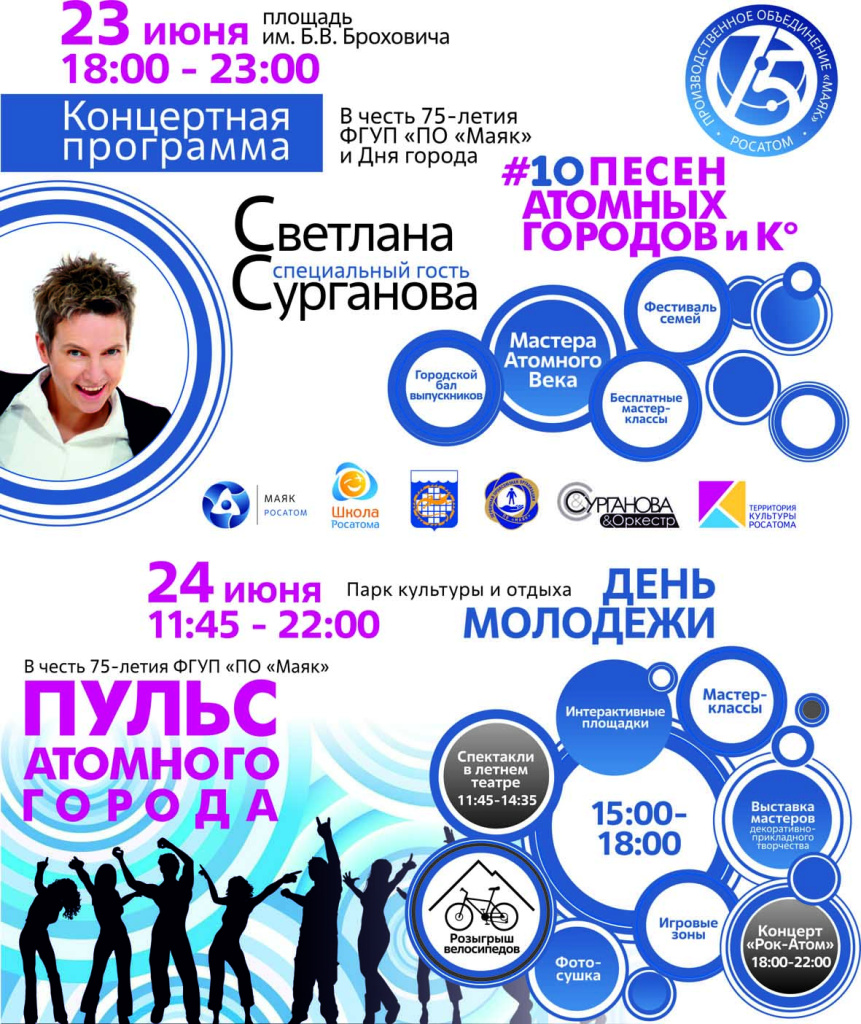 На следующий день юбилейные события продолжатся в парке культуры и отдыха. В субботу 24 июня на площадках парка пройдет праздничная программа «Пульс атомного города» , которую в 15:00 откроет Светлана Сурганова . Чуть ранее, с 11:45 до 14:35, на сцене летнего театра пройдут тематические спектакли театра драмы «Наш дом» и театра кукол «Золотой петушок».