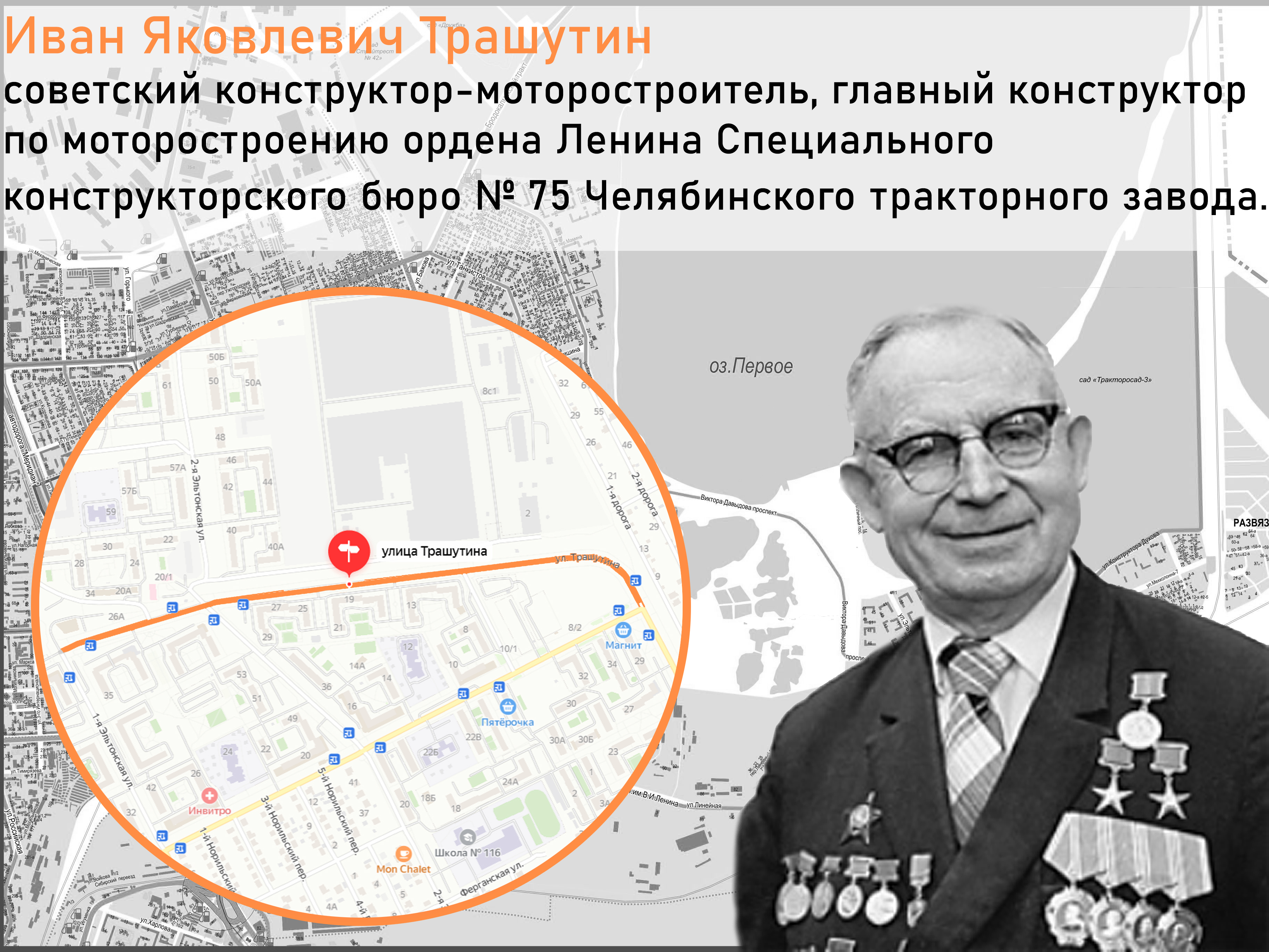 Улица Трашутина Улица Трашутина расположена в микрорайоне Чурилово. Иван Яковлевич Трашутин с 1941 года являлся главным конструктором по моторостроению ЧКЗ и специального конструкторского бюро № 75,
