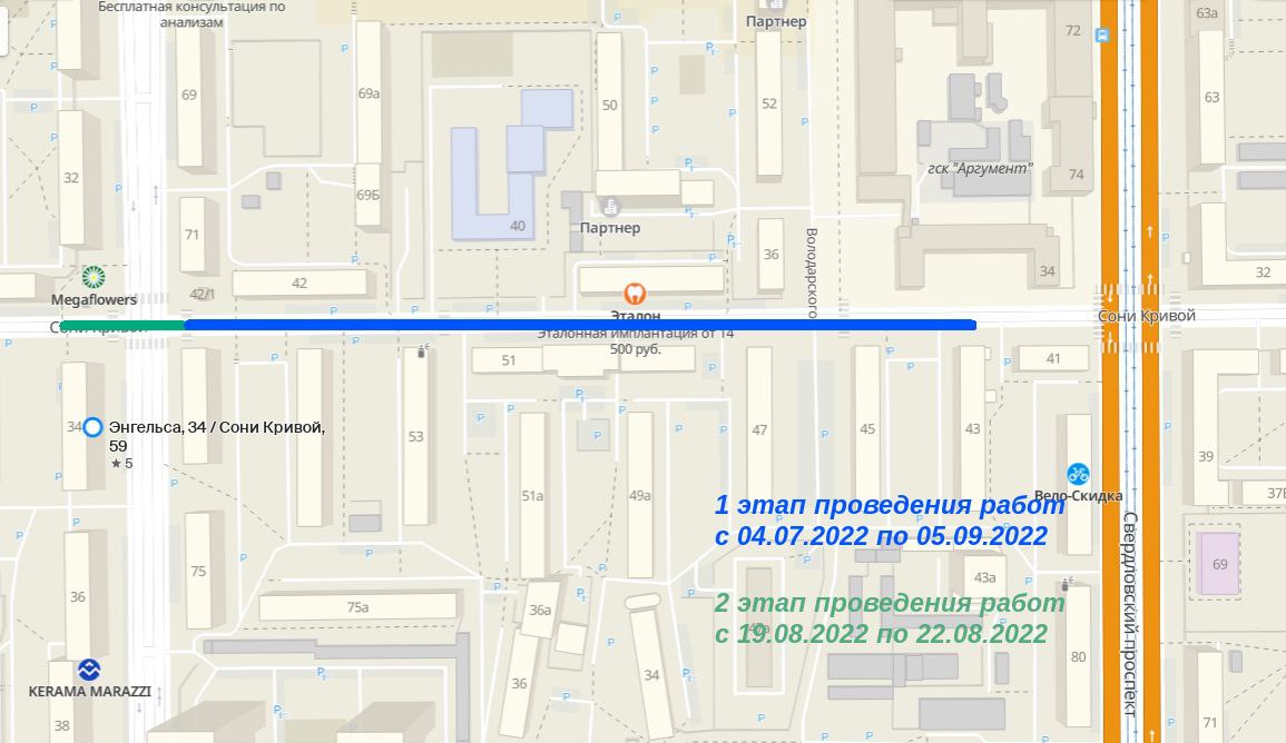 Ремонтные работы пройдут на участке от дома № 43 до дома № 59 Сони Кривой в два этапа: