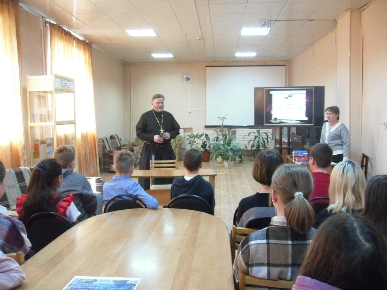 Сегодня в читальном зале Центральной районной библиотеки для учащихся МКОУ СОШ №1 библиотекари совместно с настоятелем храма святых апостолов Петра и Павла иереем Николаем, преподавателем воскресной школы храма Т.А.