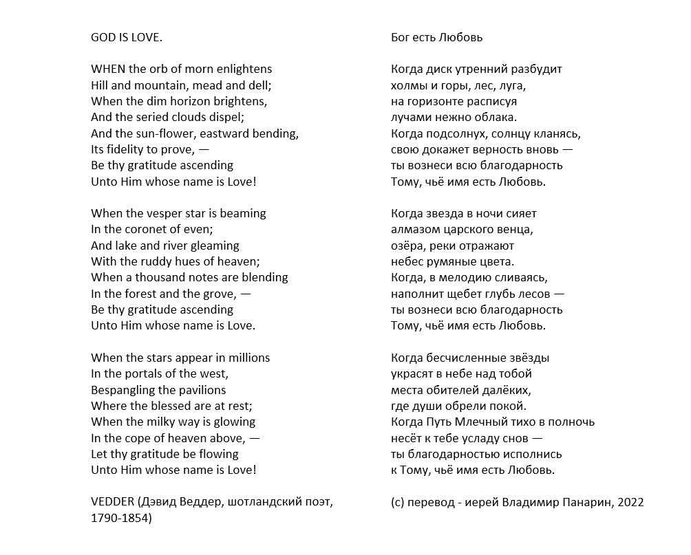 Перевод вместе с оригиналом отец Владимир публикует в своих социальных сетях, первым стало стихотворение шотландского поэта Дэвида Веддера «Бог есть Любовь» (God Is Love).