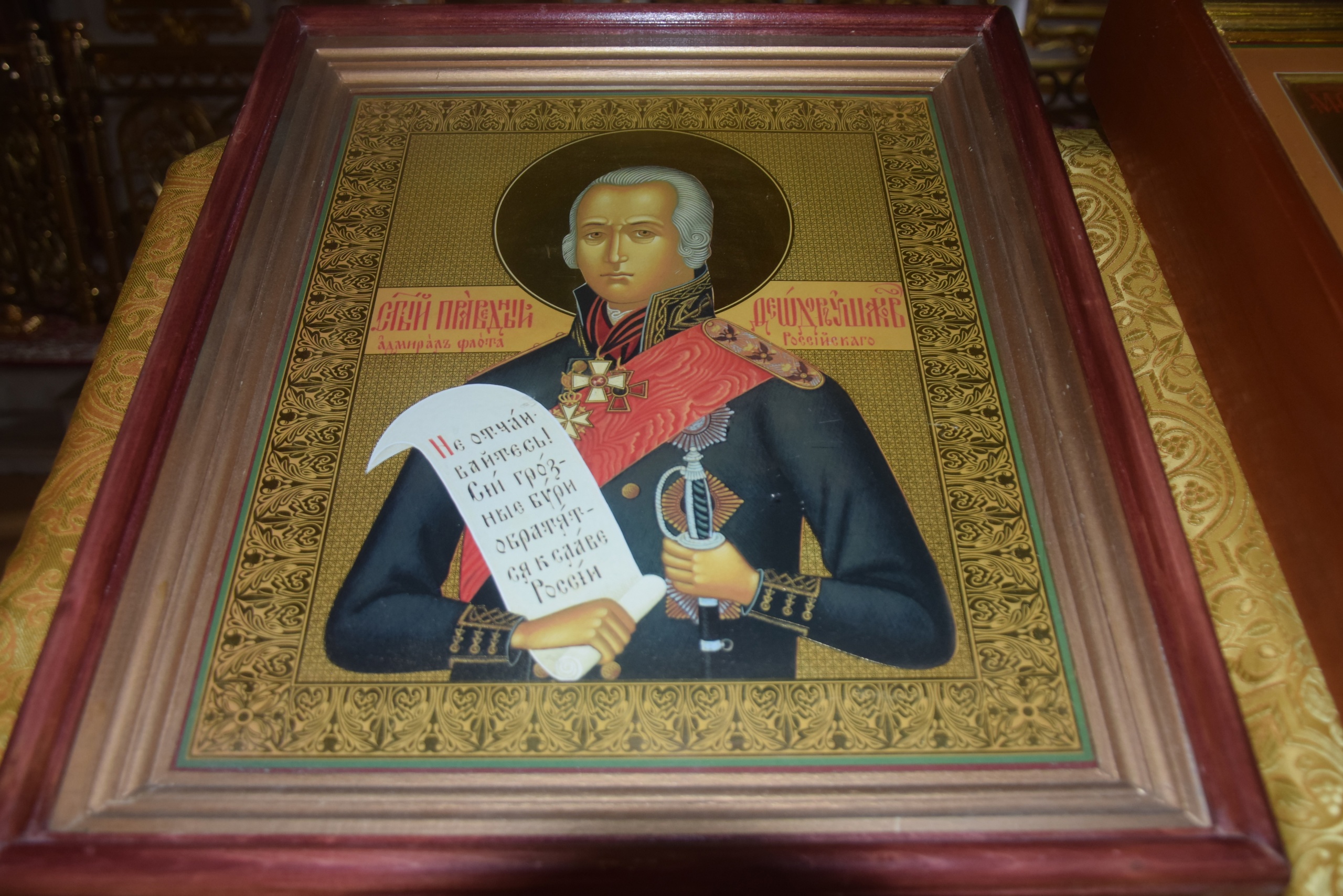 В заключении священник прочитал слова, которые начертаны на свитке, который держит в руке изображенный на соборной иконе святой праведный воин Феодор Ушаков: « Не отчаивайтесь! Сии грозные бури обратятся к славе России! ».