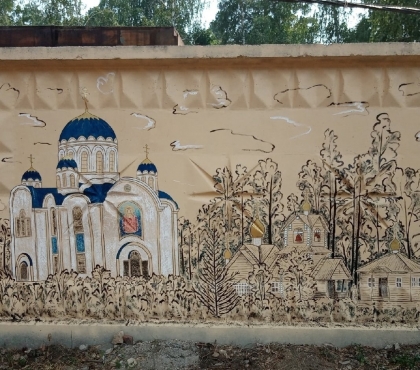 Бетонный забор вокруг строящегося храма иконы Божией Матери «Державная» в Снежинске стал настоящей картинной галерей. Местные художники изобразили на нем городские достопримечательности. Работы по возведению церкви ведутся одновременно с росписью ограждения. Проект получил благословение настоятеля храма иерея Павла Беспалова.