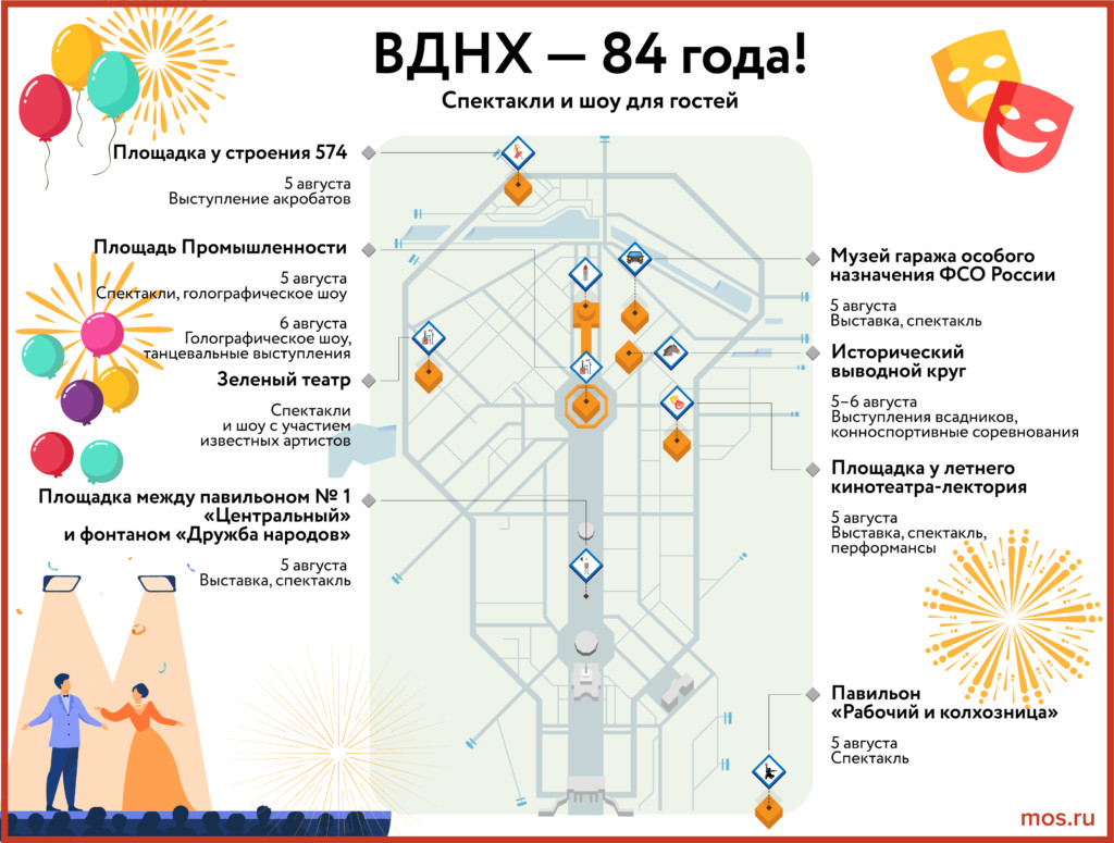 В выходные, 5 и 6 августа, на главной выставке страны пройдет праздничная программа, посвященная годовщине открытия. В субботу гости смогут вернуться в прошлое и увидеть главные исторические события, которые происходили здесь с момента основания, а в воскресенье территория превратится в воплощение футуристической мечты, где роботы встретят посетителей ВДНХ и проводят к площади Промышленности, главной площадке мероприятия в этот день. Гостей праздника ждут выступления артистов, пластические спектакли, шоу-программы, познавательные экскурсии и обучающие лекции. Подробная программа мероприятий доступна на сайте выставки.