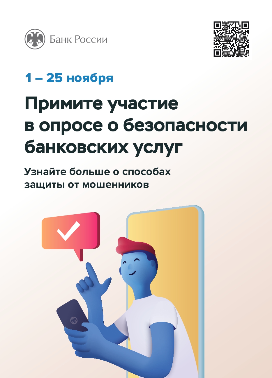 Банк России в целях повышения защищенности потребителей финансовых услуг и удовлетворенности продуктами (услугами) финансовых организаций до 25 ноября 2022 года проводит опрос для определения степени удовлетворенности населения и юридических лиц уровнем безопасности финансовых услуг, оказываемых организациями кредитно-финансовой сферы.