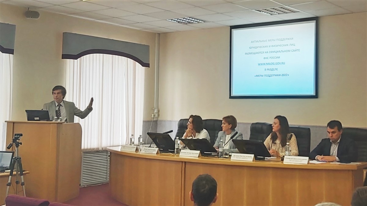 Начальник отдела налогообложения юридических лиц С. В. Перов и начальник отдела налогообложения доходов физических лиц и администрирования страховых взносов Е. В. Зотова разъяснили меры поддержки бизнеса в условиях сложившейся социально-экономической ситуации в 2022 году.