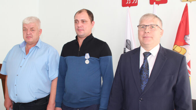Заместитель главы Каслинского района Вячеслав Горобец и военный комиссар Дмитрий Ласьков вручили государственную награду участнику специальной военной операции — младшему сержанту Алексею Мошеву.