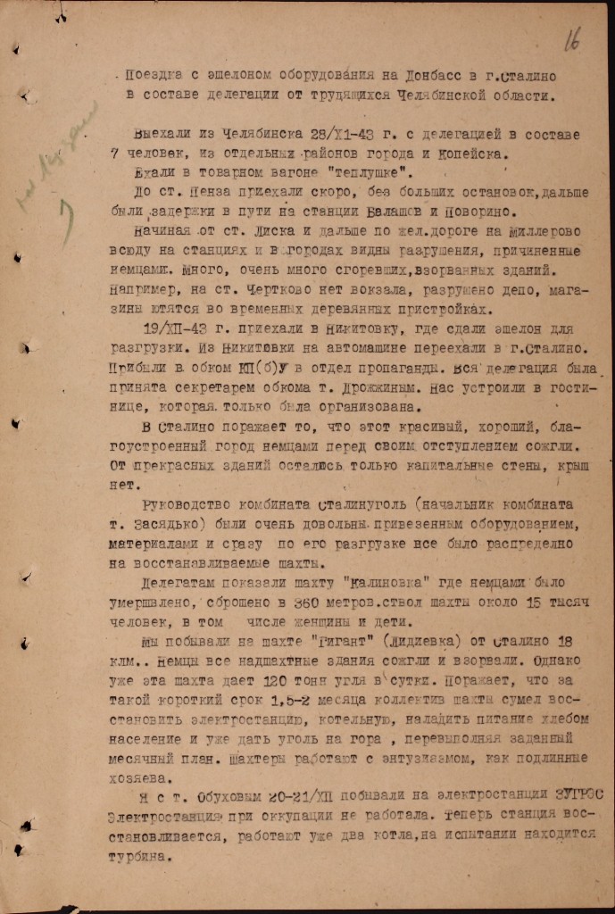 19/XII—[19]43 г. приехали в Никитовку, где сдали эшелон для разгрузки. Из Никитовки на автомашине переехали в г. Сталино. Прибыли в обком КП(б)У[42] в отдел пропаганды. Вся делегация была принята секретарем обкома т. Дрожжиным. Нас устроили в гостинице, которая только была организована.