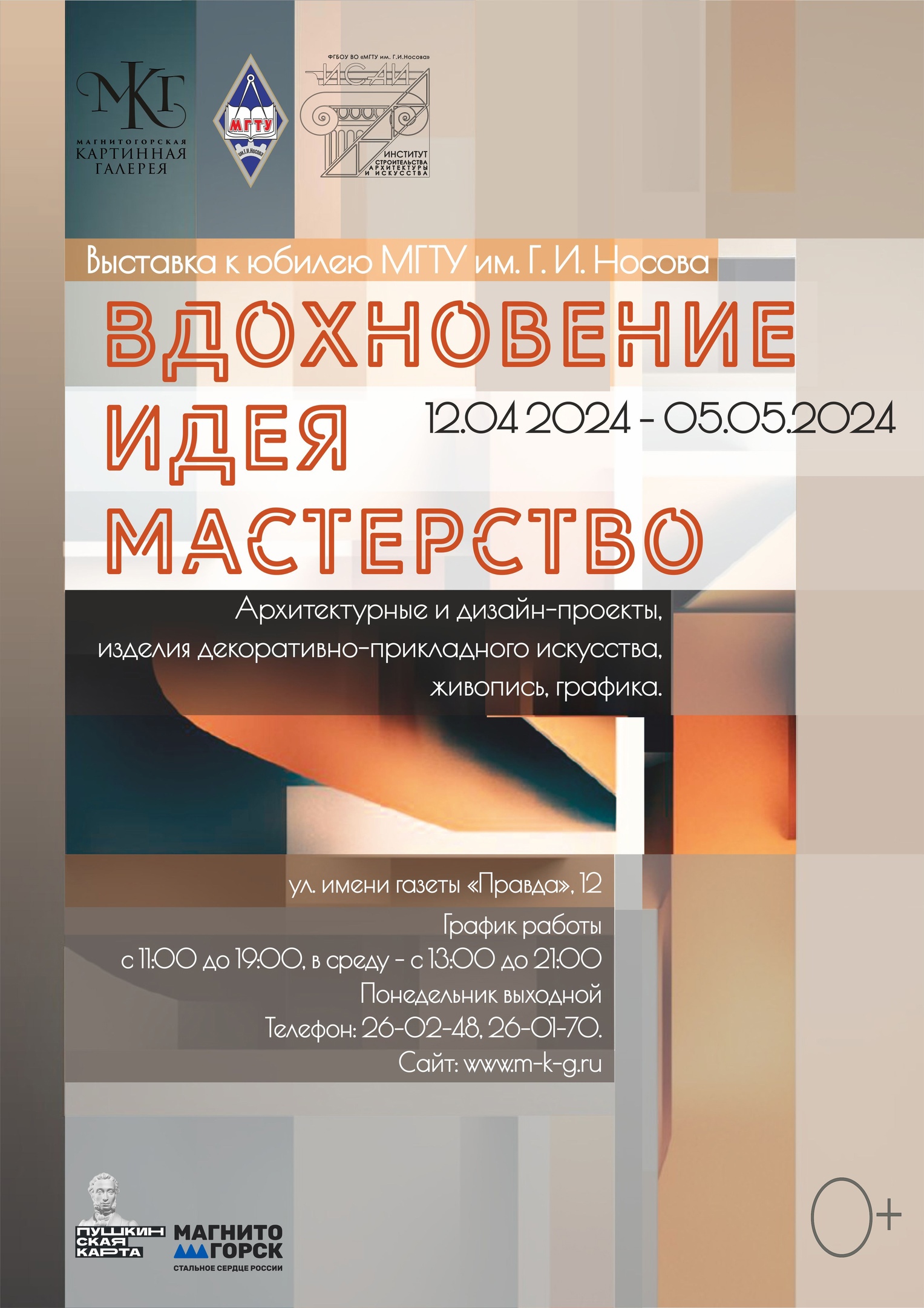 Завтра, 12 апреля, в Магнитогорской картинной галерее открывается выставка «Вдохновение, идея, мастерство» приурочена к 90-летию МГТУ им. Г. И. Носова. В работе выставки участвуют кафедра архитектуры и изобразительного искусства, кафедра художественной обработки материалов и кафедра дизайна института строительства, архитектуры и искусства.