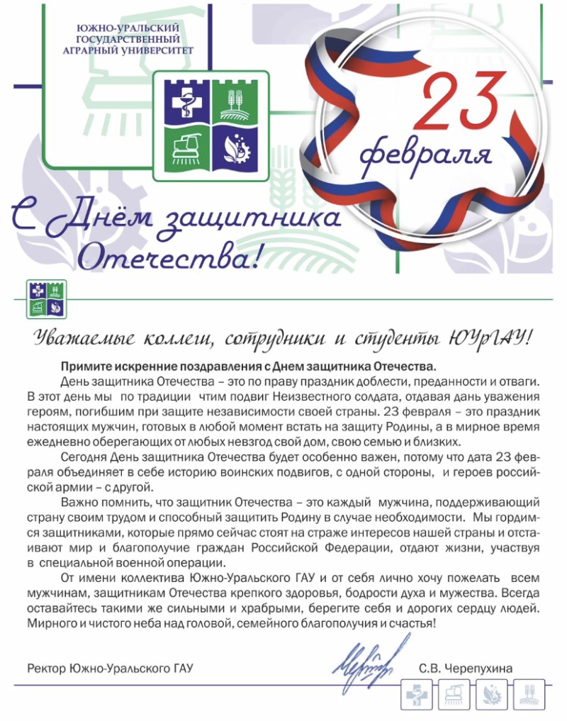 От имени коллектива Южно-Уральского ГАУ и от себя лично хочу пожелать всем мужчинам, защитникам Отечества крепкого здоровья, бодрости духа и мужества. Всегда оставайтесь такими же сильными и храбрыми, берегите себя и дорогих сердцу людей. Мирного и чистого неба над головой, семейного благополучия и счастья!