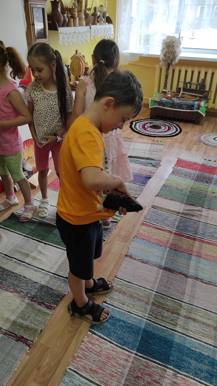 После экскурсии у детей было свободное время, детворе дали возможность свободно передвигаться от экспоната к экспонату. Мальчикам больше всего понравились тяжелые утюги, а девочкам – старинная одежда и ухват с горшочком, каток и валёк.
