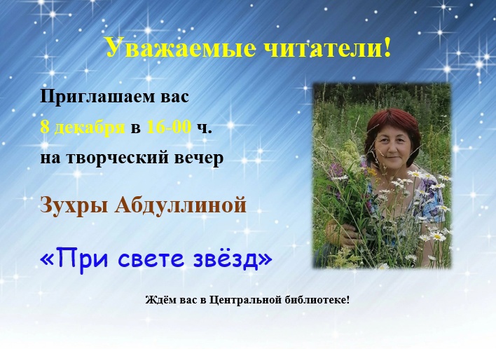 В этот четверг, 8 декабря, в 16-00 часов состоится творческий вечер "При свете звёзд" Зухры Абдуллиной.