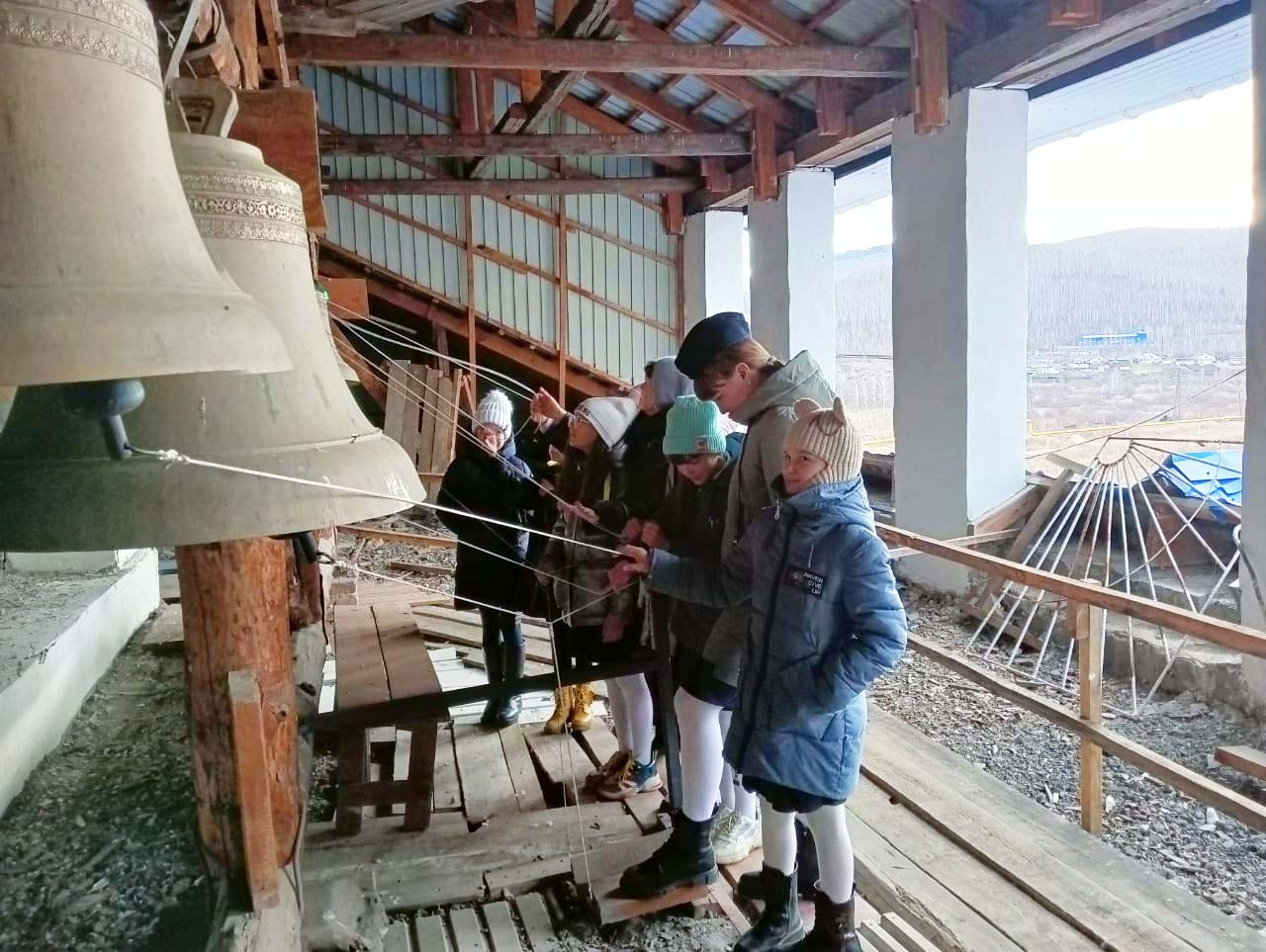 Сначала ребята послушали рассказ О. Ю. Колпаковой и С. В. Мокрушиной о духовных ценностях человечества, а потом И. В. Ожеговой провела урок колокольного звона на звоннице Никольского храма.