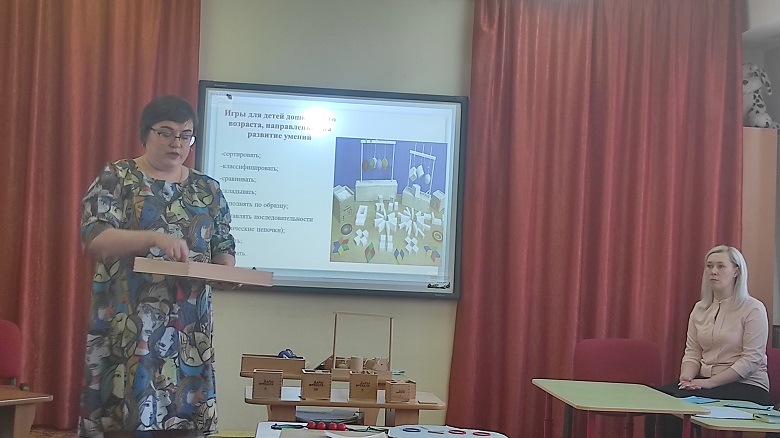 Особое внимание было уделено практической части, где педагогам представилась возможность самим поиграть с различными деталями дидактического пособия Фребеля. Воспитатели из деталей конструктора создавали сюжеты сказок, изображали на полотне ответы на загадки, демонстрировали использование деталей в разных образовательных областях: на занятиях по развитию речи, математике, изобразительной деятельности, на занятиях по физкультуре. Воспитатели дали высокую оценку этого мероприятия: