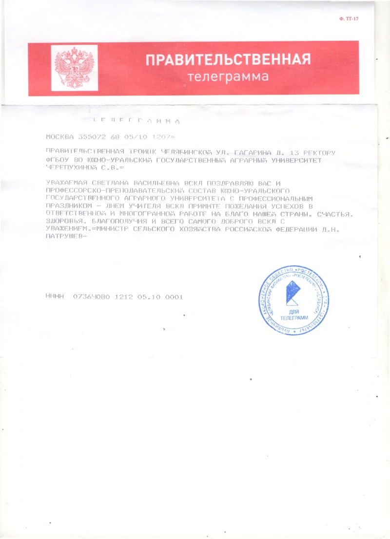Министр сельского хозяйства РФ Д.Н. Патрушев поздравил ректора ЮУрГАУ и профессорско-преподавательский состав вуза с Днем учителя