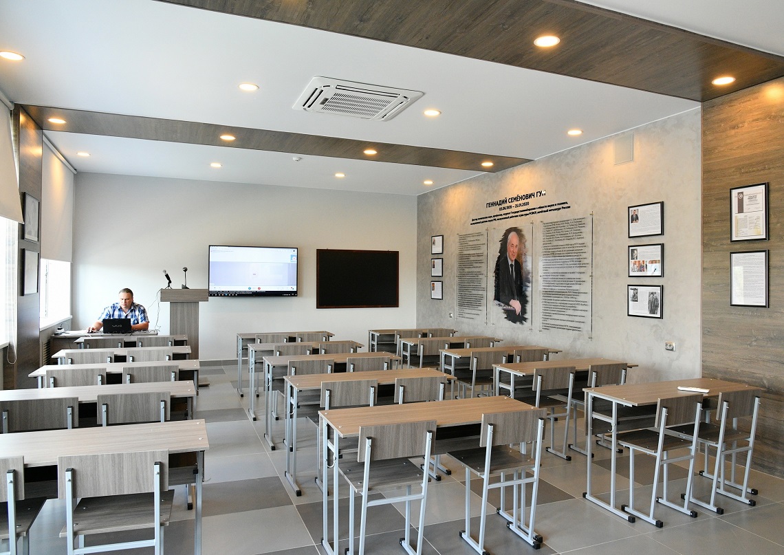 Современная и просторная – в новой аудитории созданы все условия для успешной учебы. Здесь установлено цифровое оборудование, благодаря которому доступен широкий спектр мультимедийных возможностей. А оформление кабинета тесно связано с личность Гуна. Разработчики дизайн-проекта постарались передать разноплановость профессора и его многочисленные таланты.