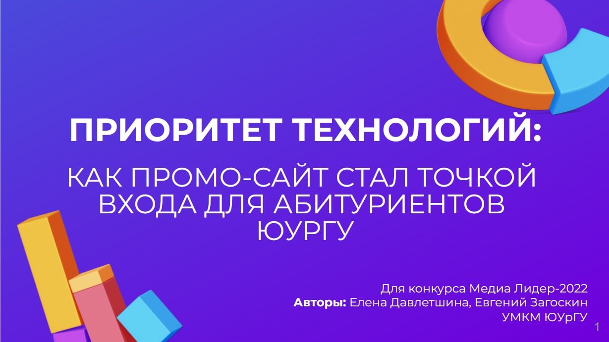 Проект «Приоритет технологий - как промо-сайт стал точкой входа для абитуриентов ЮУрГУ» участвовал в конкурсе "Медиалидер - 2022" в номинации «Лучшее digital-издание для клиентов» и соревновался с 9 другими конкурсантами. Всего на конкурс было подано больше 350 проектов в 19 номинациях. По итогам оценки жюри проект УМКМ ЮУрГУ занял второе место.