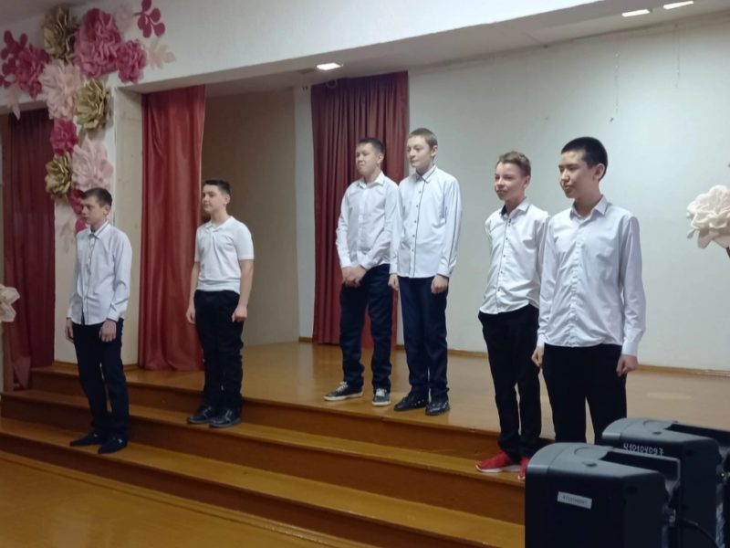 Ведущие концерта Захар Горев и Матвей Алябьев поздравили всех присутствующих в зале дам, пожелали им здоровья, счастья, успехов, процветания, любви. Много хороших слов от своего имени и от имени школьников они произнесли в адрес учителей, сотрудниц образовательной организации. До слез слова благодарности и любви тронули мам и бабушек. Не остались без внимания и девочки, им были посвящены стихи.